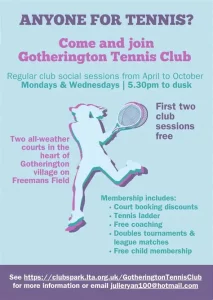 Gotherington Tennis Club Website: https://gotheringtonparishcouncil.org.uk/village-information/parish-groups/tennis-club/
